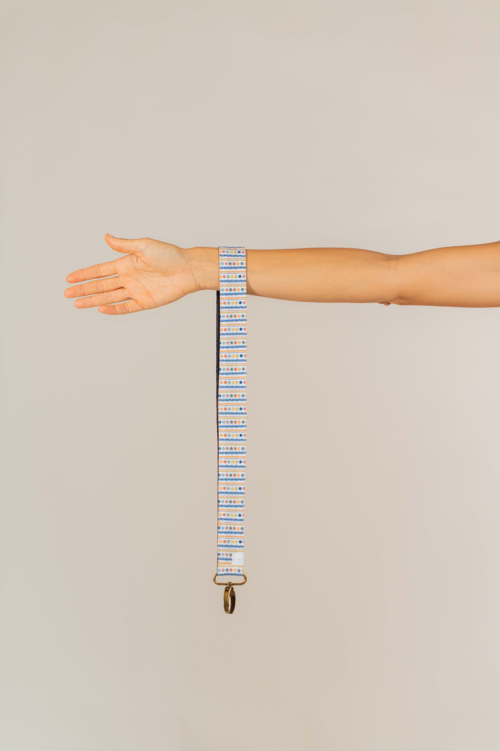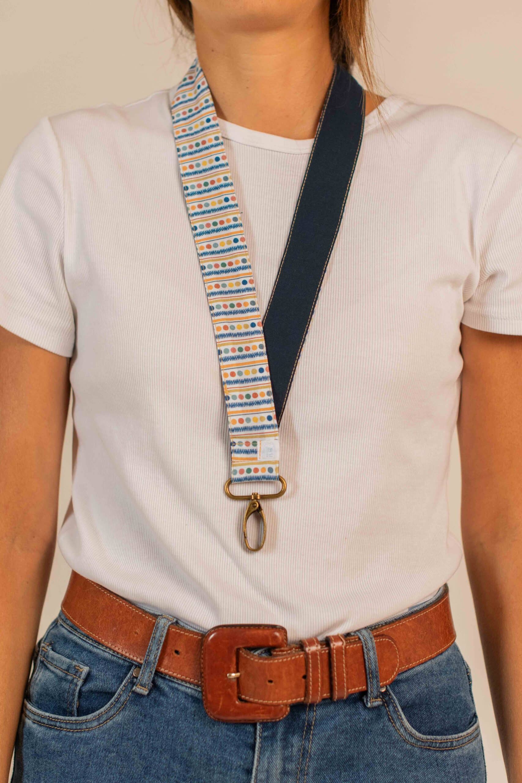 El lanyard Marine es el complemento ideal para maestras que prefieren un estilo más elegante y discreto. Confeccionado a mano con el mismo estampado geométrico en tonos neutros que los bolsillos de la bata Marine, es práctico, cómodo y combina con todo.